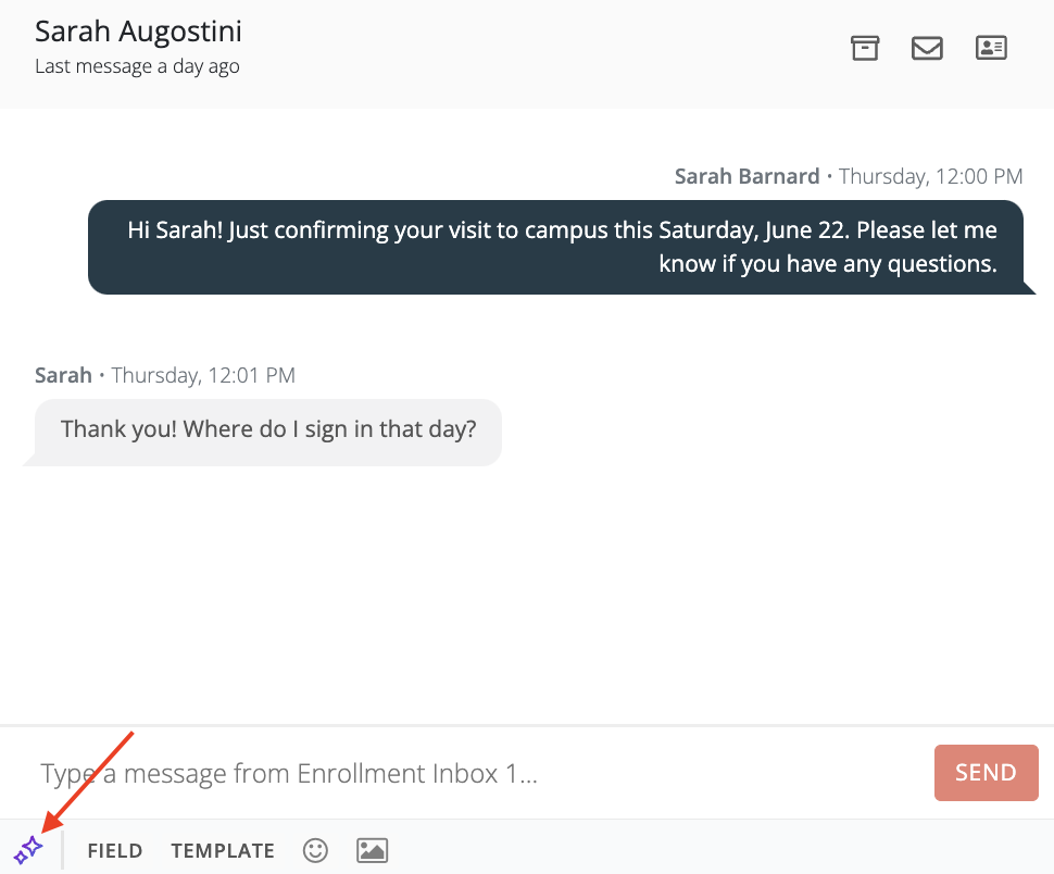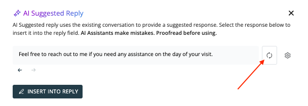 The AI Suggested Reply will pop up and suggest a response based on the last 48 hours of conversation with the contact. To choose a different variation of the message, click the refresh icon for a new generated response.