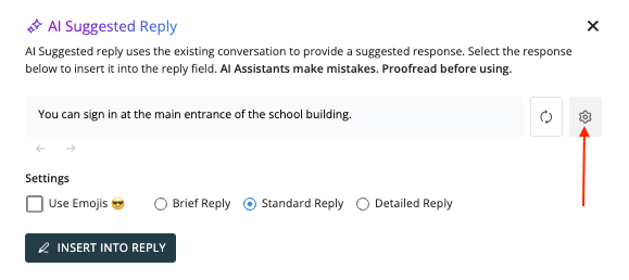 By default, "Standard Reply" is selected. The settings button allows you to customize your response to reflect your tone when texting whether you want that to be a brief reply, a standard reply or a more detailed reply. You can also select to include emoji's in the generated reply.
