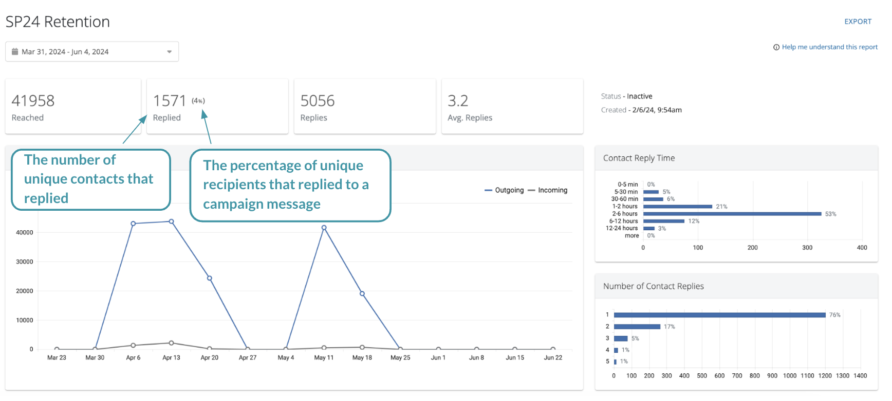 Campaign reports provide a detailed view of outgoing and incoming message activity is available for each campaign. Campaigns are shared across all users and admins within a team and any user/admin can view the campaign report.