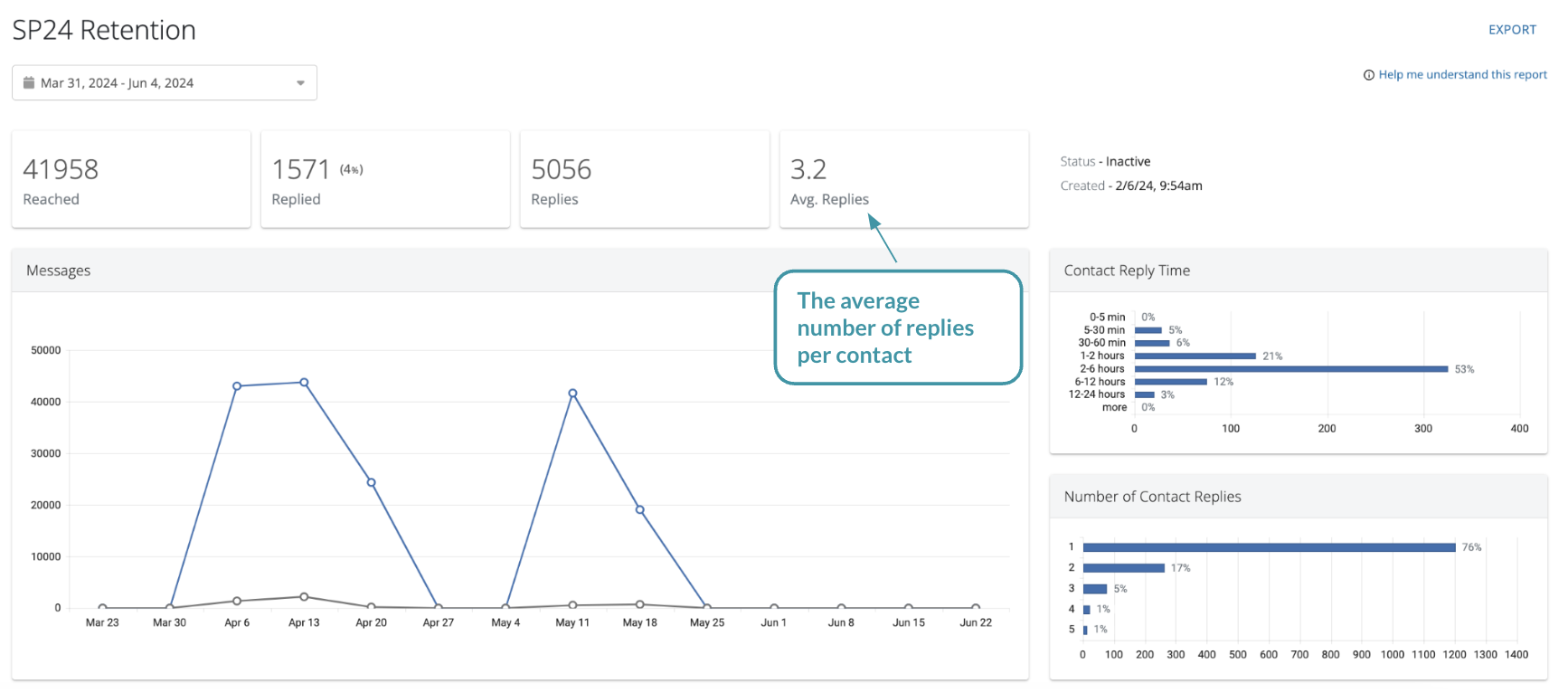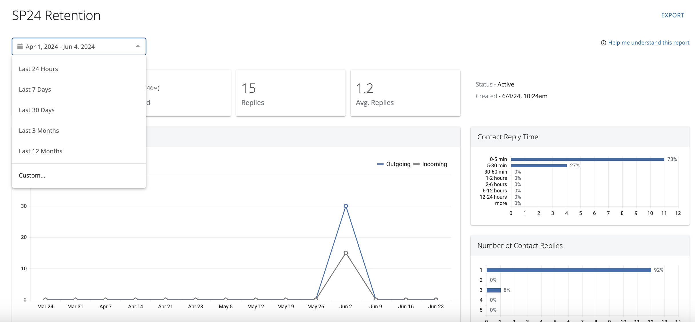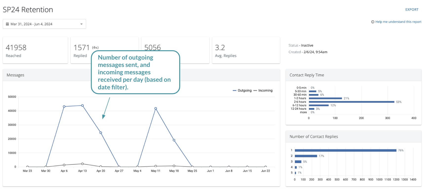 Each Campaign report has a date filter that allows you to view Campaign metrics for the selected date range. The "Export" option will provide a .csv file contact data and incoming message information for the selected date range.