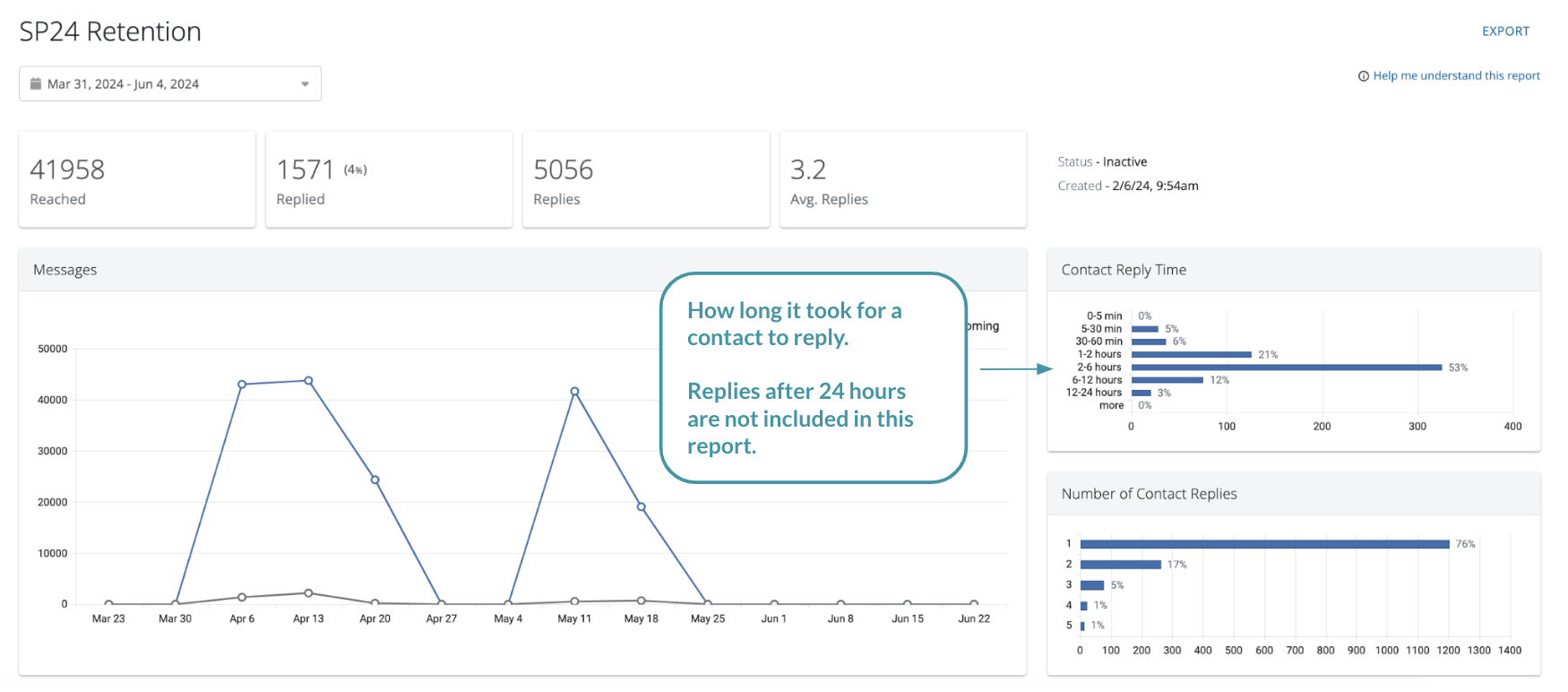 • The campaign report does not display contact data or incoming message text however, you can use the "Export" option for more detailed information.