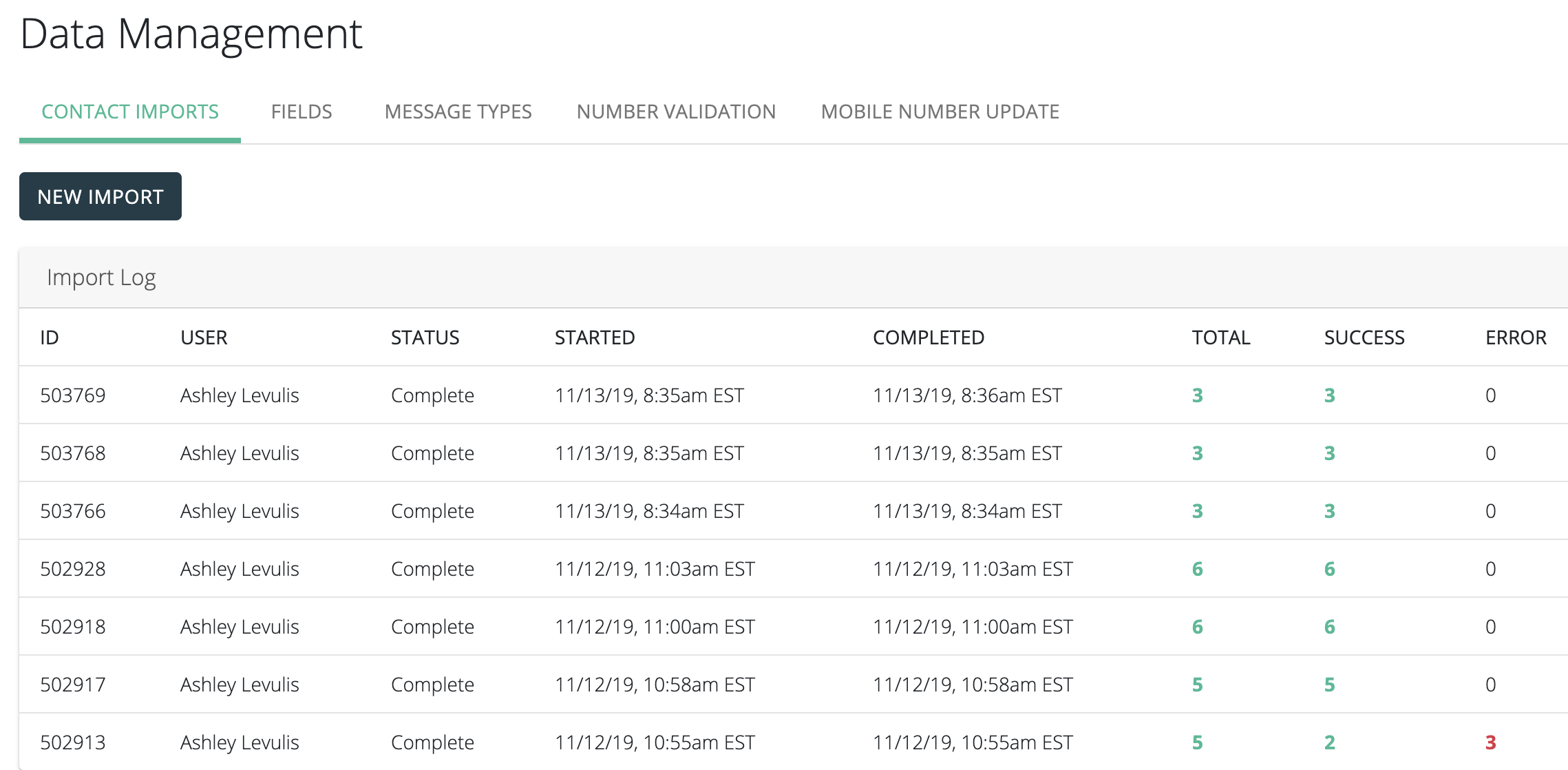 The 50 most-recent imports (or last 15 days) will be displayed, showing who initiated the import, the status, the date started/completed, and the results. The numbers in the Total/Success/Error columns are hyperlinked and will generate a file for you to view.