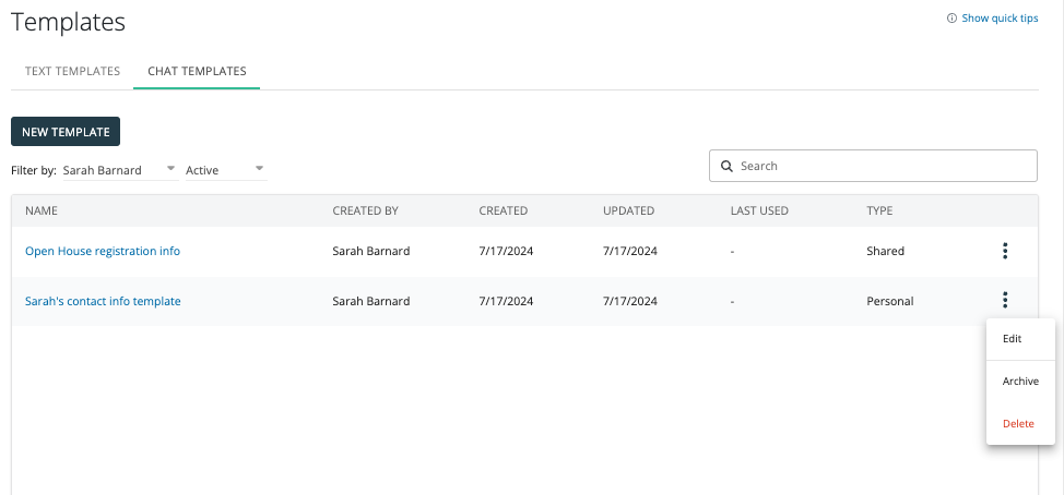 To edit, archive, or delete a template, click the menu option (3 vertical dots)>Edit or Delete.