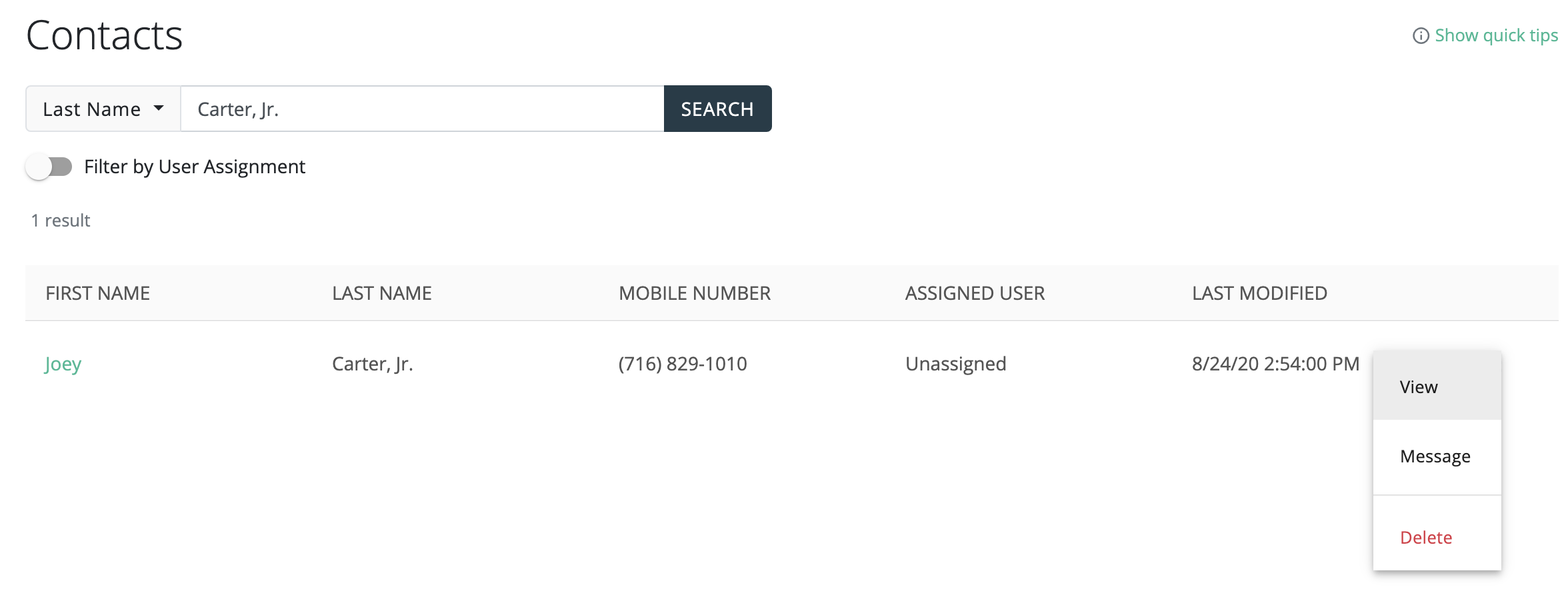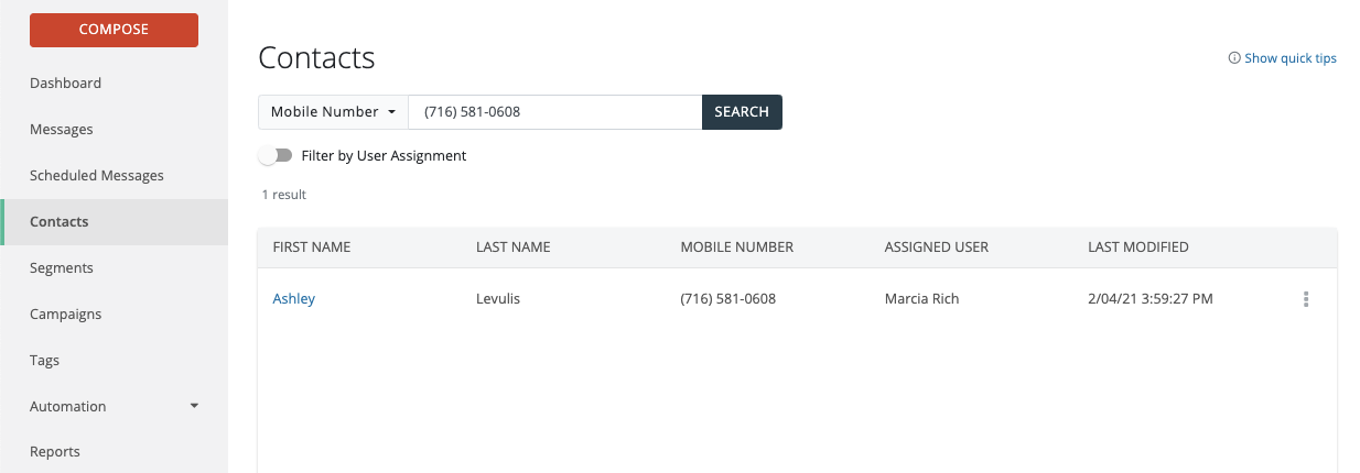 - If you would like to preserve the old record because you would like to retain any conversations with that record/number in Mongoose, we recommend opting the record out to prevent users from mistakenly sending messages to that record/number. Click the dots to the right, then click View to opt the contact out.
