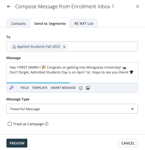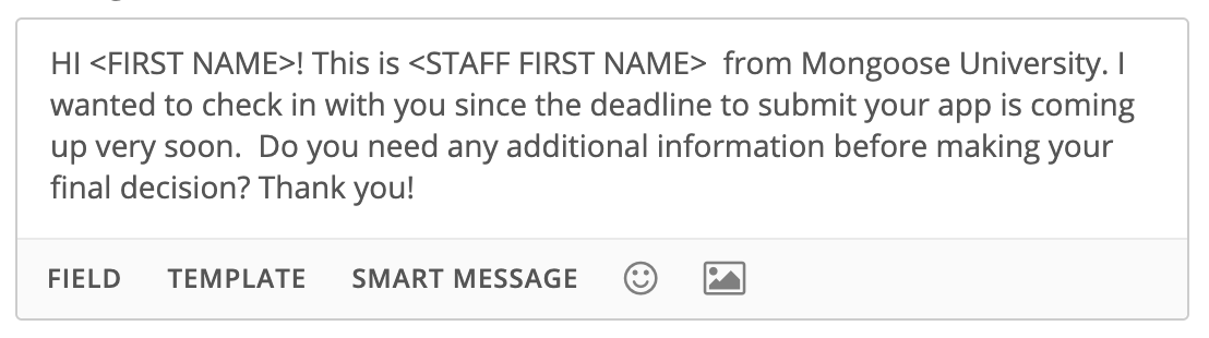 4B. If desired, you can include merge fields and automatically bring in data from the contact's record by clicking on Field, utilize a pre-written text message by clicking on Template, or include emojis. Optionally, you could also choose to use a smart message. (Reply messages allow for more characters for scenarios that require more information.)