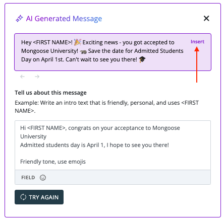 When you find a generated template that you like, click "insert" and the message will be added to the text box of the template.
