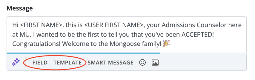 4B. If desired, you can include merge fields and automatically bring in data from the contact's record by clicking on Field, utilize a pre-written text message by clicking on Template, or include emojis or images.