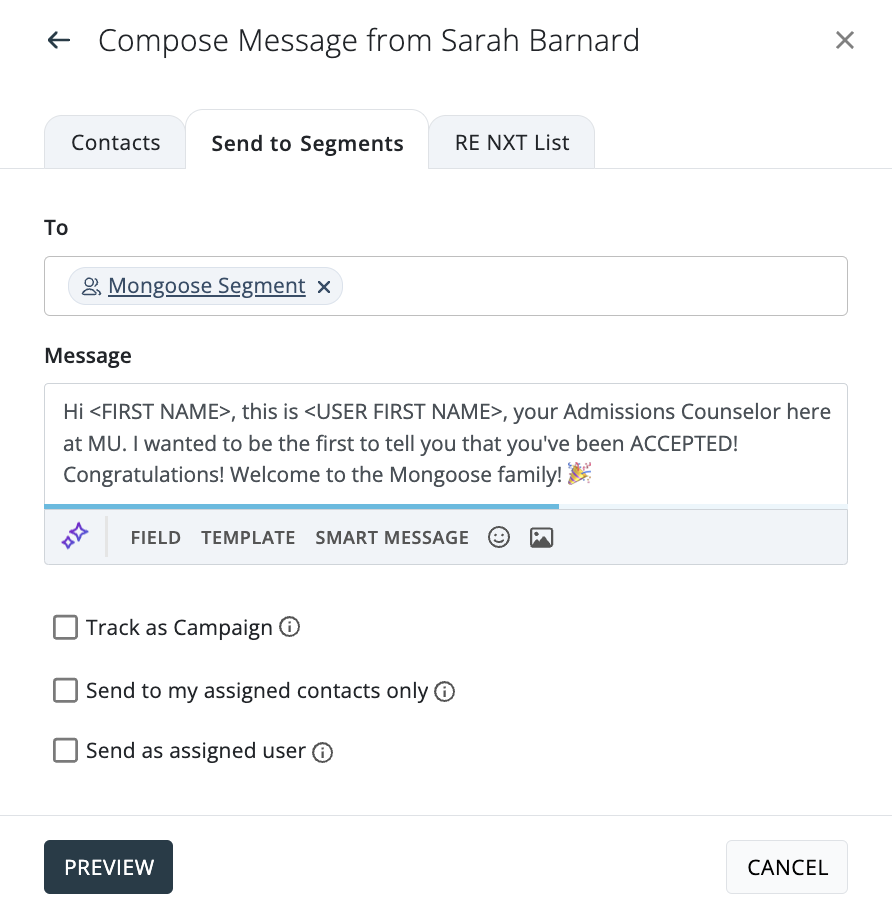 2. Determine if you are sending to a contact or a pre-created Segment and select the corresponding tab.