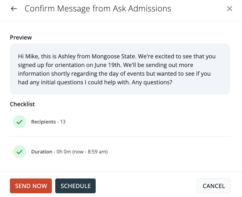 7. After you review your message (and correct any issues, if necessary), you can click [ Send Now] to send the message immediately or [Schedule] to schedule the message for a future date/time.