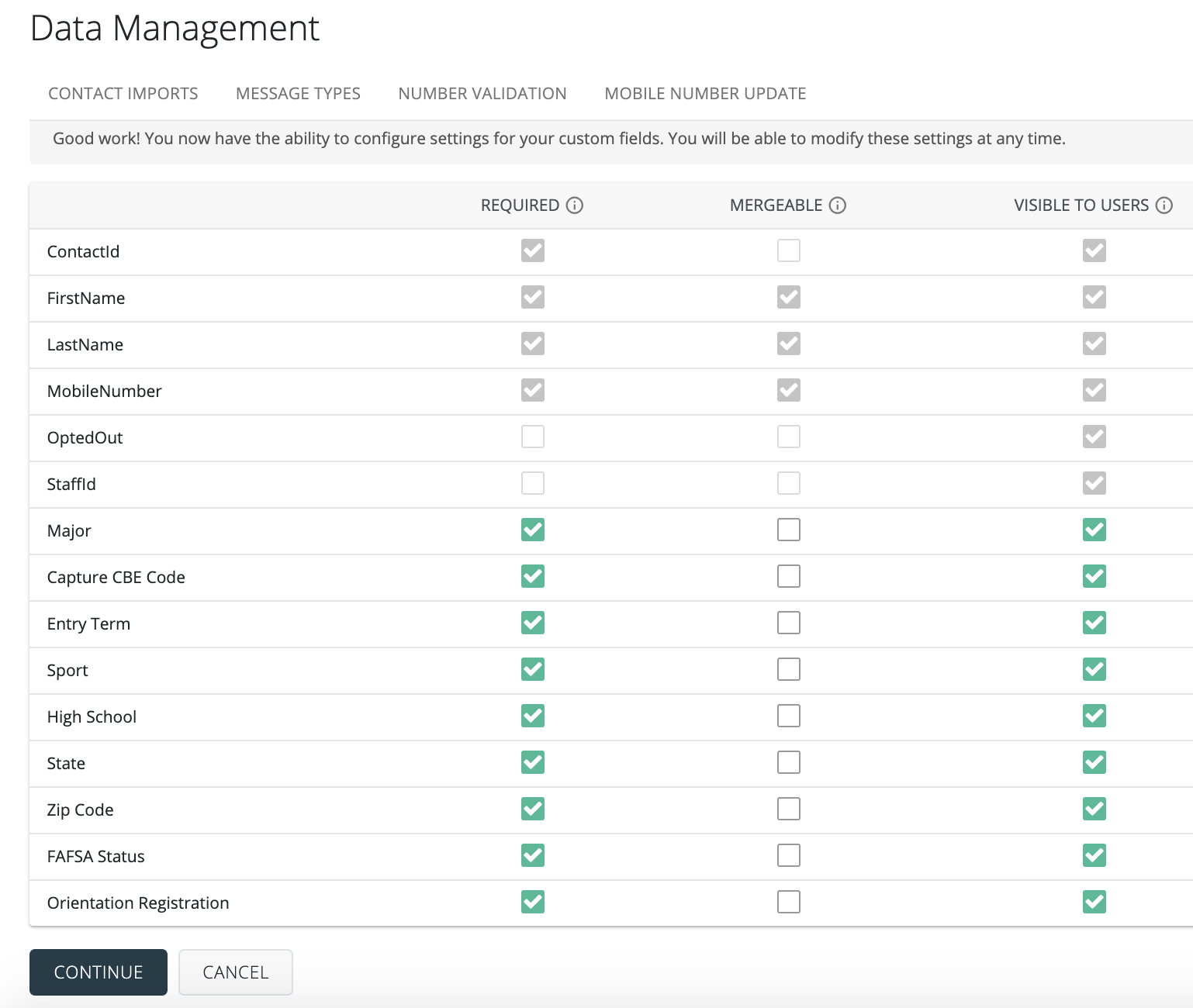 3. Specify Required, Mergeable, and Visible to Users settings. Click [Continue] to complete the process.