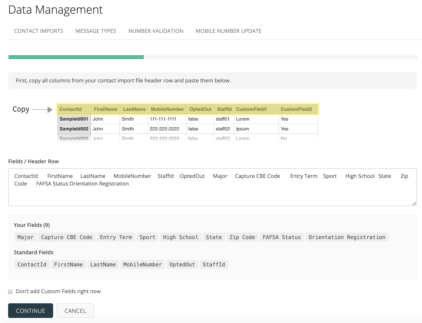 Contact imports can be configured to ensure data quality as new contact records are added over time. In addition to the standard fields for each contact that is imported, you can specify up to 25 additional custom fields.