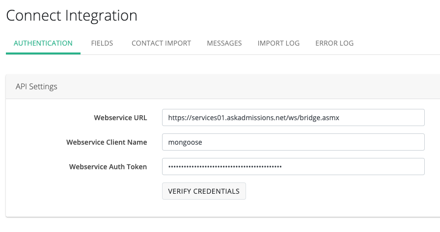 Enter in your Connect credentials, click "Save" and then click the "Verify Credentials" button.