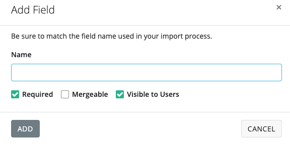 Click [ Add Field] in order to specify a field that will be imported into Mongoose from the contact record in Connect. You can give it the same name as it has in Connect or specify a different name.