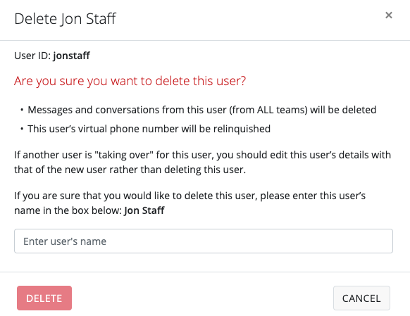 - If the user you are deleting has had recent conversations with contacts, it is a best practice to reach out to those contacts and let them know the number is no longer going to belong to that user. If possible, provide an alternate number for the contact to use.