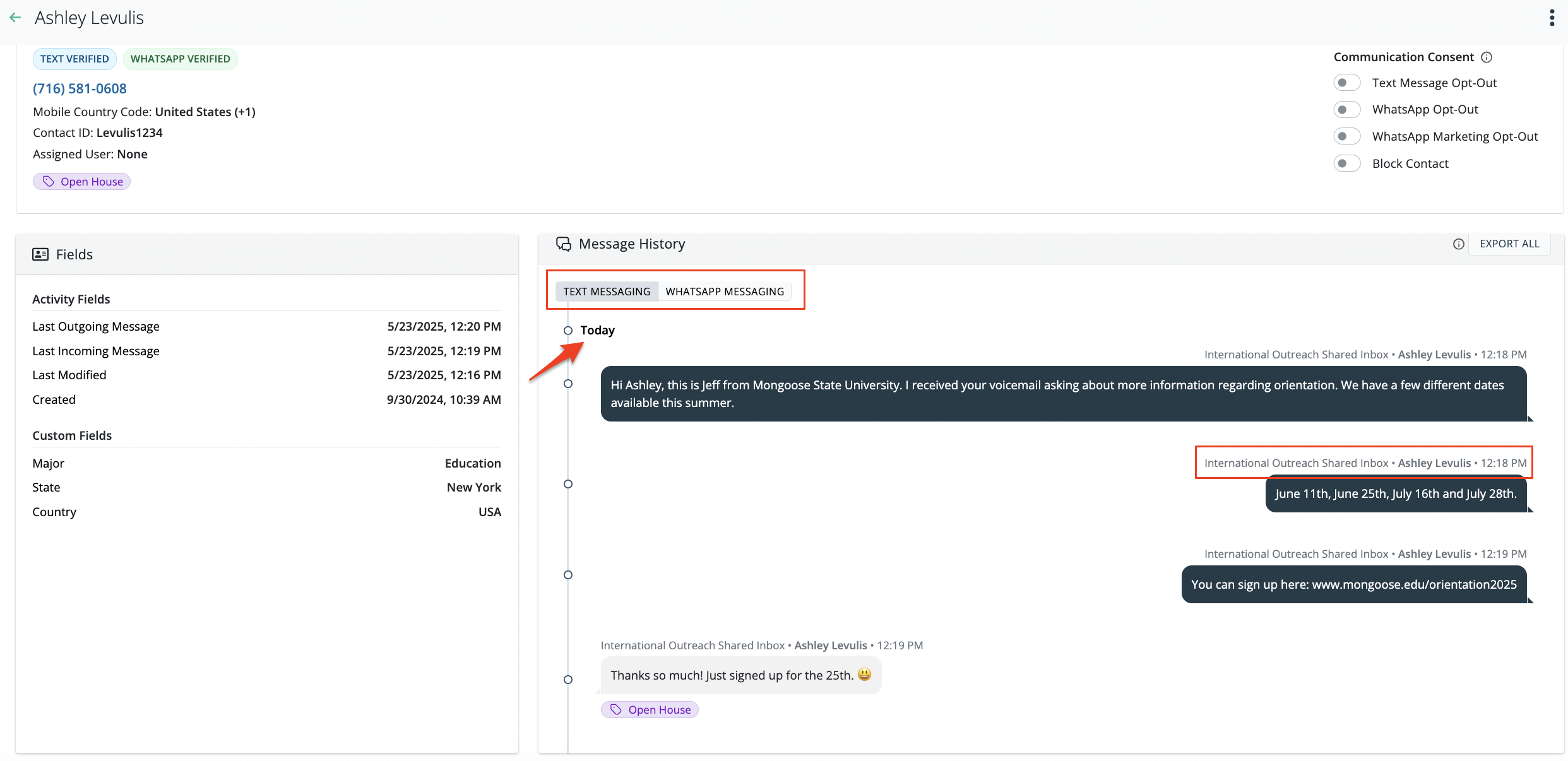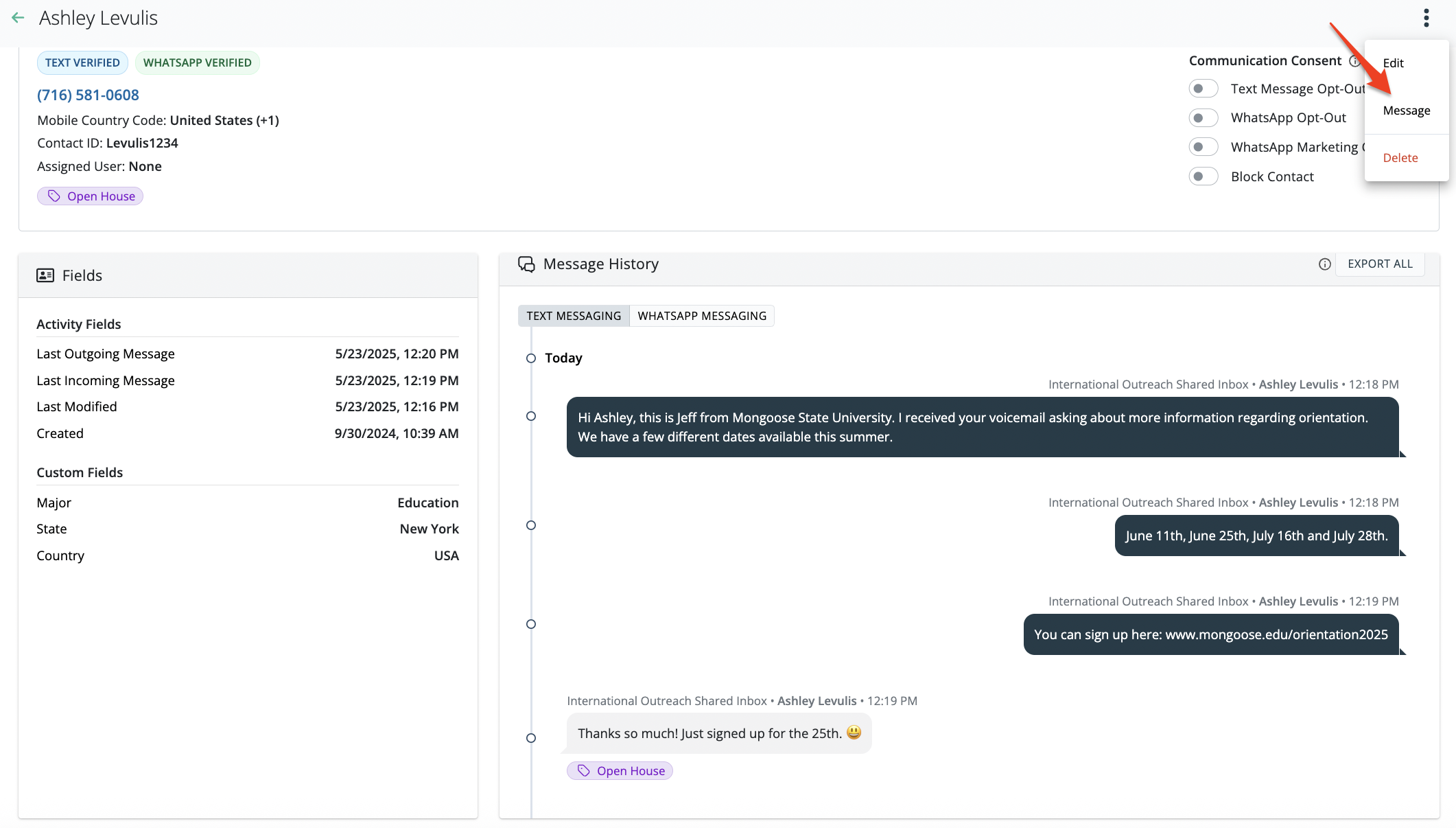 The contact profile is where you'll find the conversation history. This profile provides an overall view of the contact where you'll be able to see the contact information, activity details, custom fields and message history. You also maintain the ability to manage the contact's opt out preference or block the contact from this page.