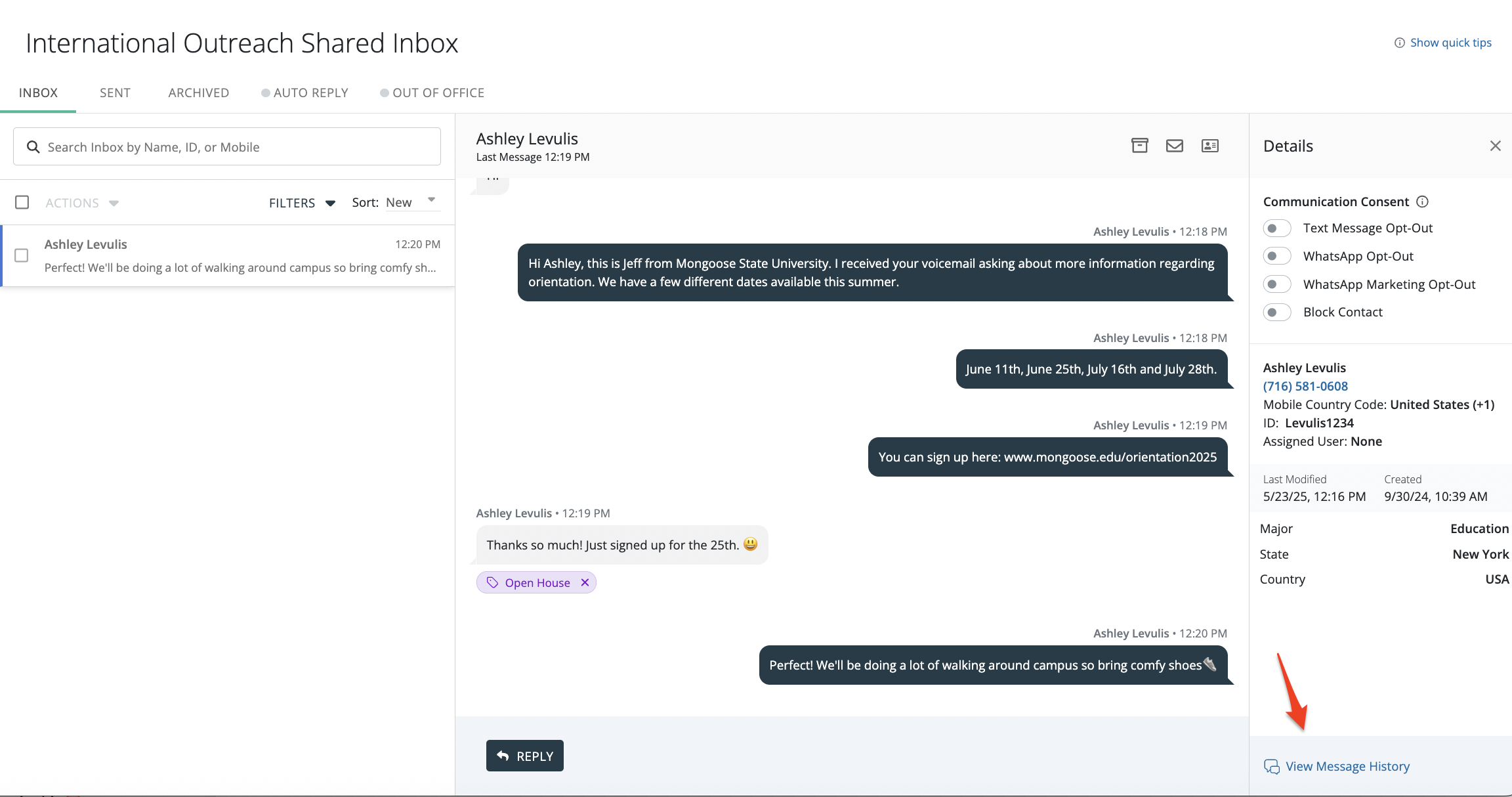 Note: Conversation history only displays two years of message history. All message history (outside of this 2 year window) can be exported under Reports>Message Activity.