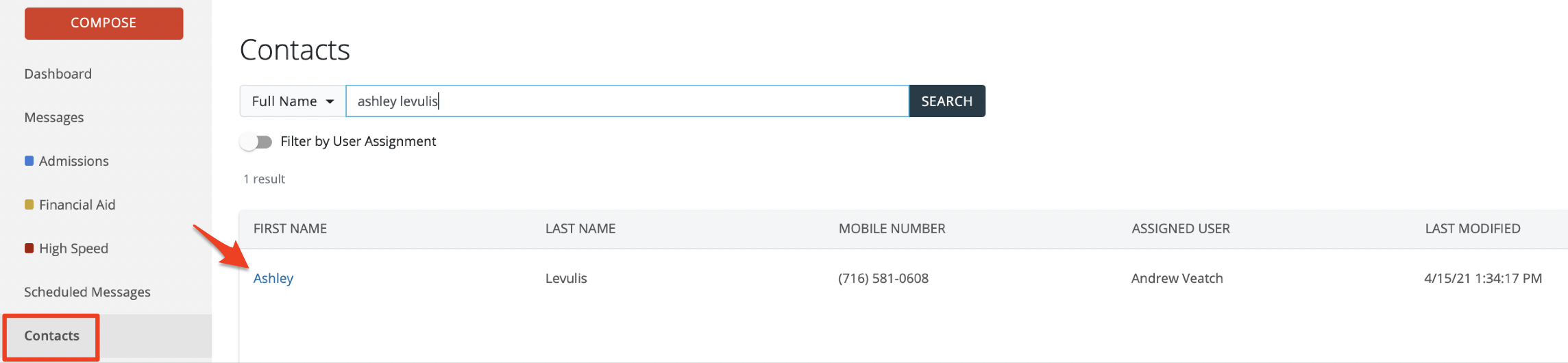 You can also search for a contact via the Contacts page. Within the search bar, search for a contact>Click on the name of the contact to view their message history.