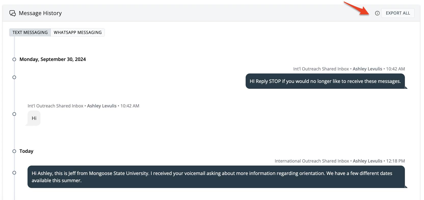 To export a contacts messaging history, click Export All.