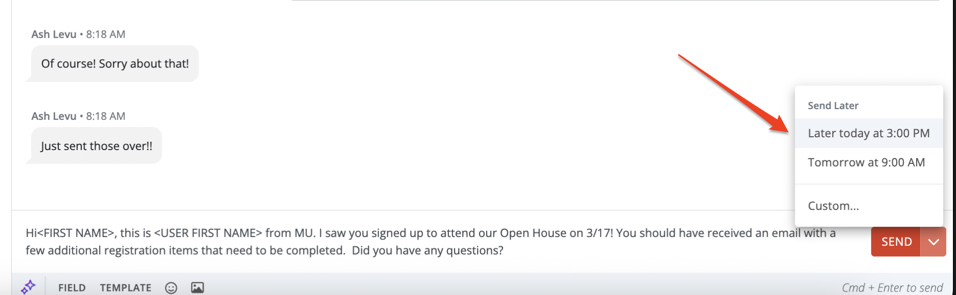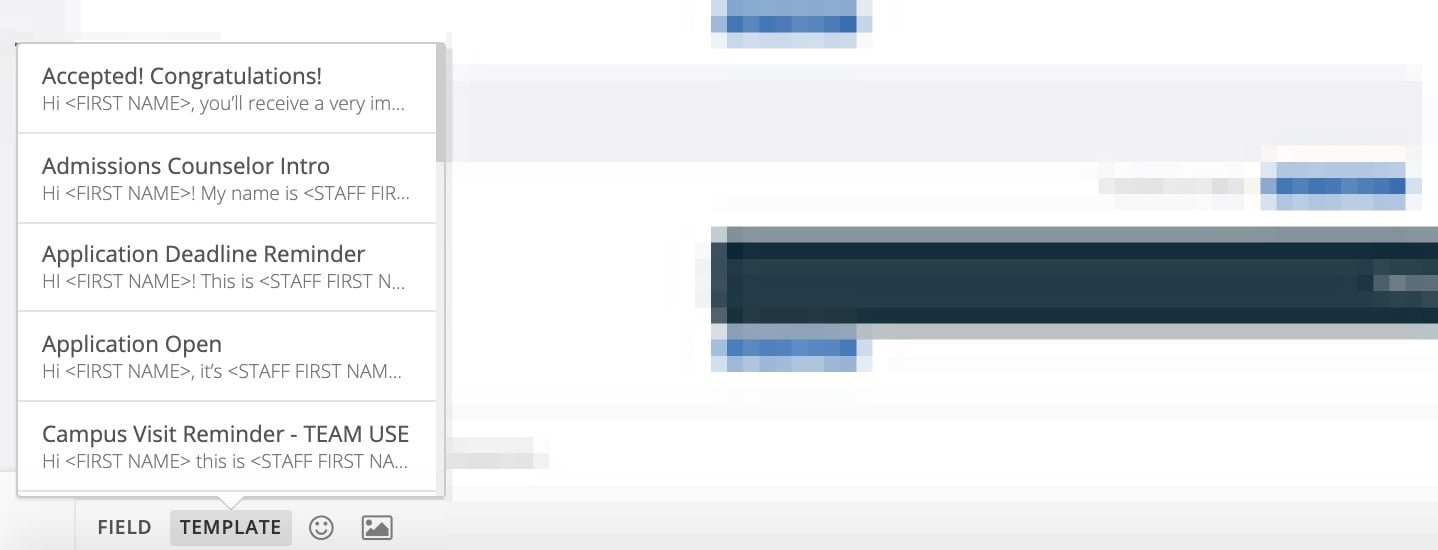 Click on Template to utilize a pre-written text message in lieu of typing a response. Your team's Admin is responsible for creating and maintaining the list of templates available to the team. Strategically, it is beneficial to have response-specific templates set up to be used when sending from the conversation view.