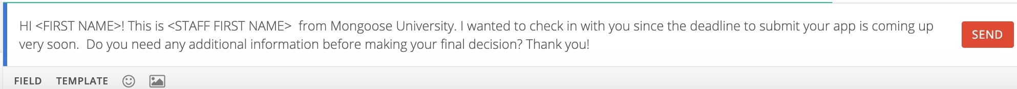 Click on Field to include a merge field from the contact's record; this will insert the merge field's placeholder (e.g., " "). When the contact receives the text, the placeholder will be filled in with the correct information from the contact's Mongoose record.