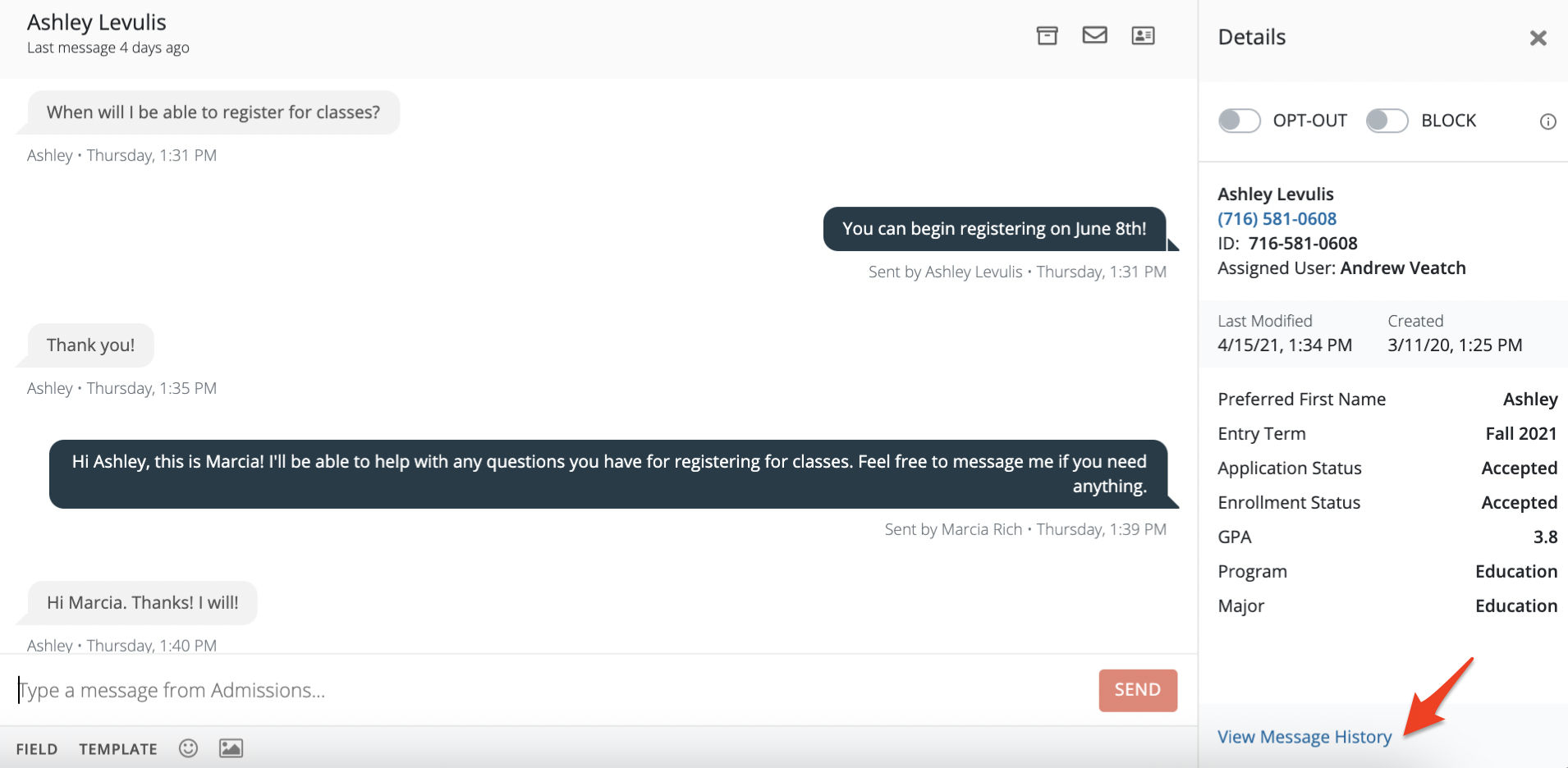 Clicking on "View Message History" will take you to the contact profile page to see all conversation history for that contact across users in your team.