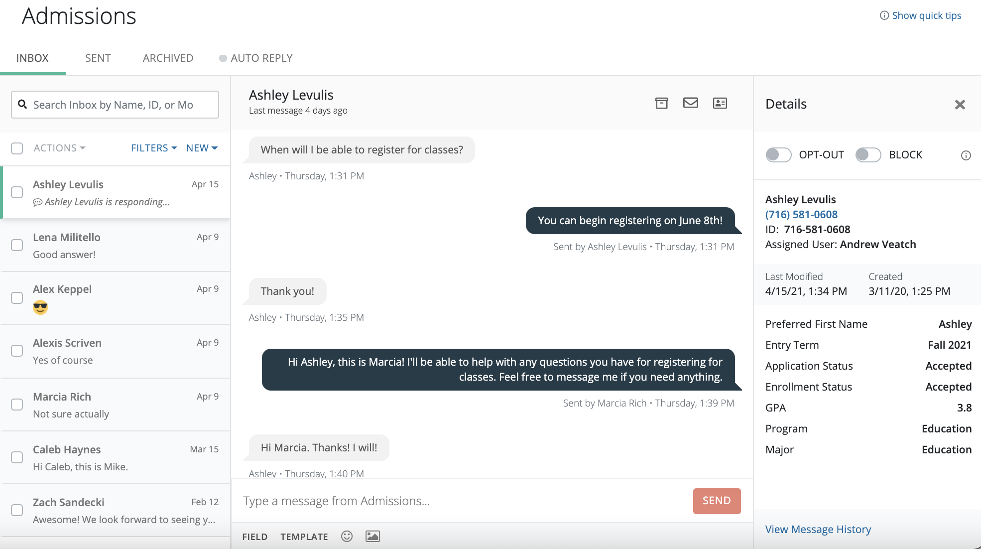The conversation view allows you to efficiently scroll through your conversation history with a contact and see the dates and times associated with your correspondence. You can send a text message to the contact (more on this below) and utilize the same functions you have access to under the Compose area--merge fields, templates, emoji, and MMS.