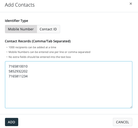 3A. To add more contacts to the segment, click [ Add Contacts]. New contacts can be added based on StudentId/ContactId or Mobile Number.