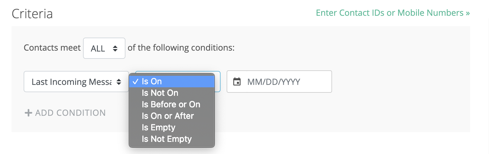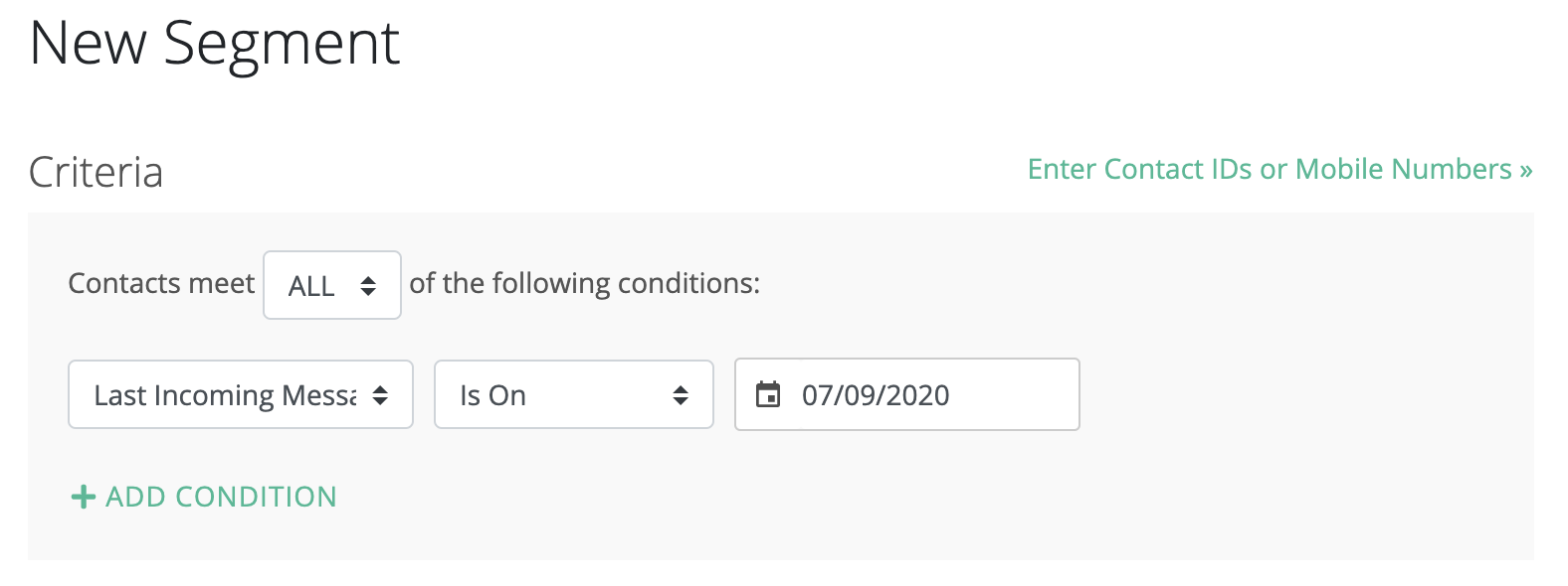 Note: If you would like to manually create a segment using an identifier, click Enter Contact IDs or Mobile Numbers. A guide to Identifier-Based Segments can be found here.
