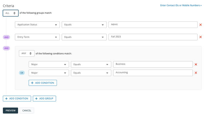 - [Edit] will take you back to the previous screen to adjust the conditions/criteria. (Note: Select this option if the number of contacts in the preview is too large, or if the conditions/criteria did not return the data you were looking for.)