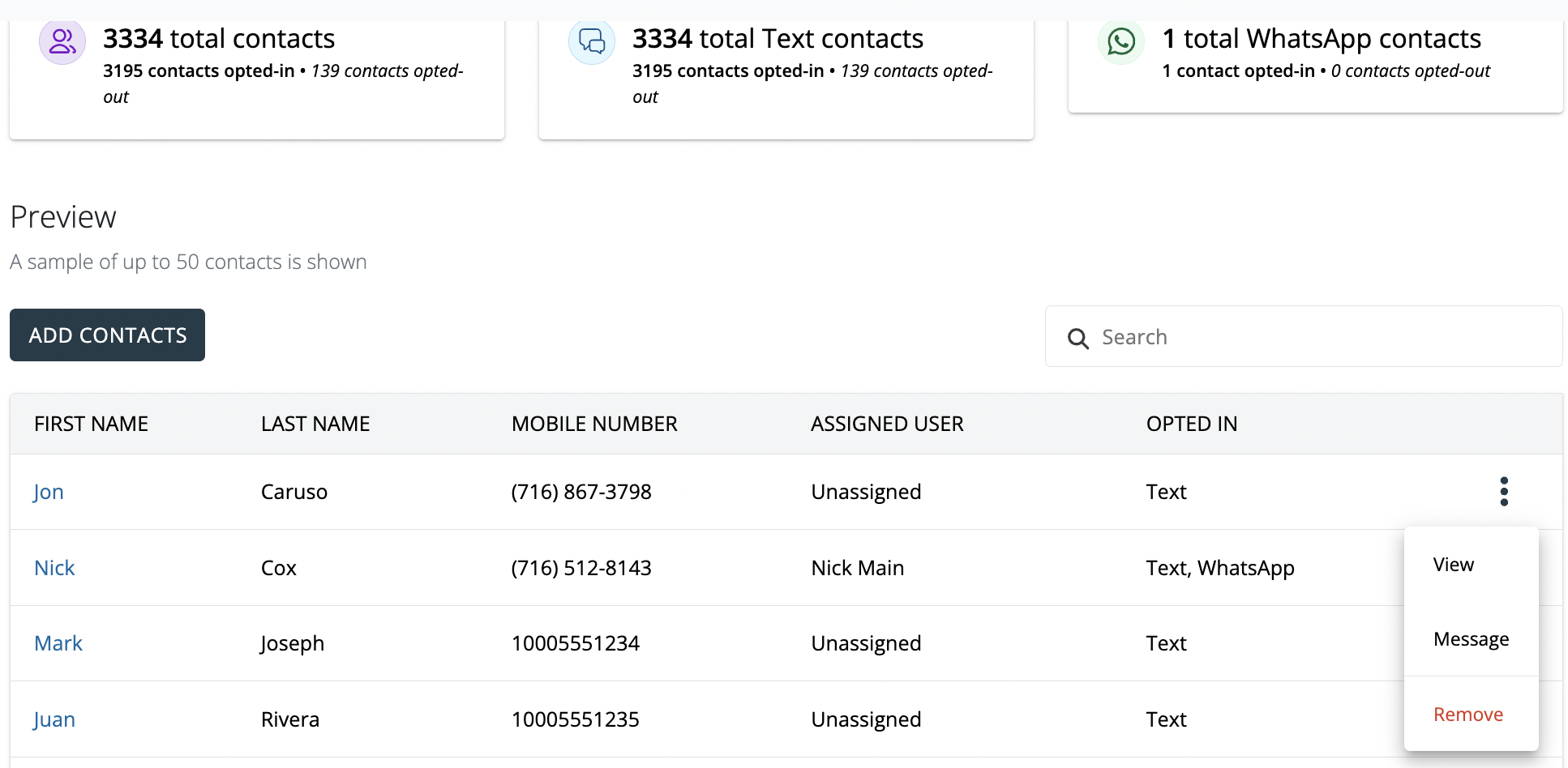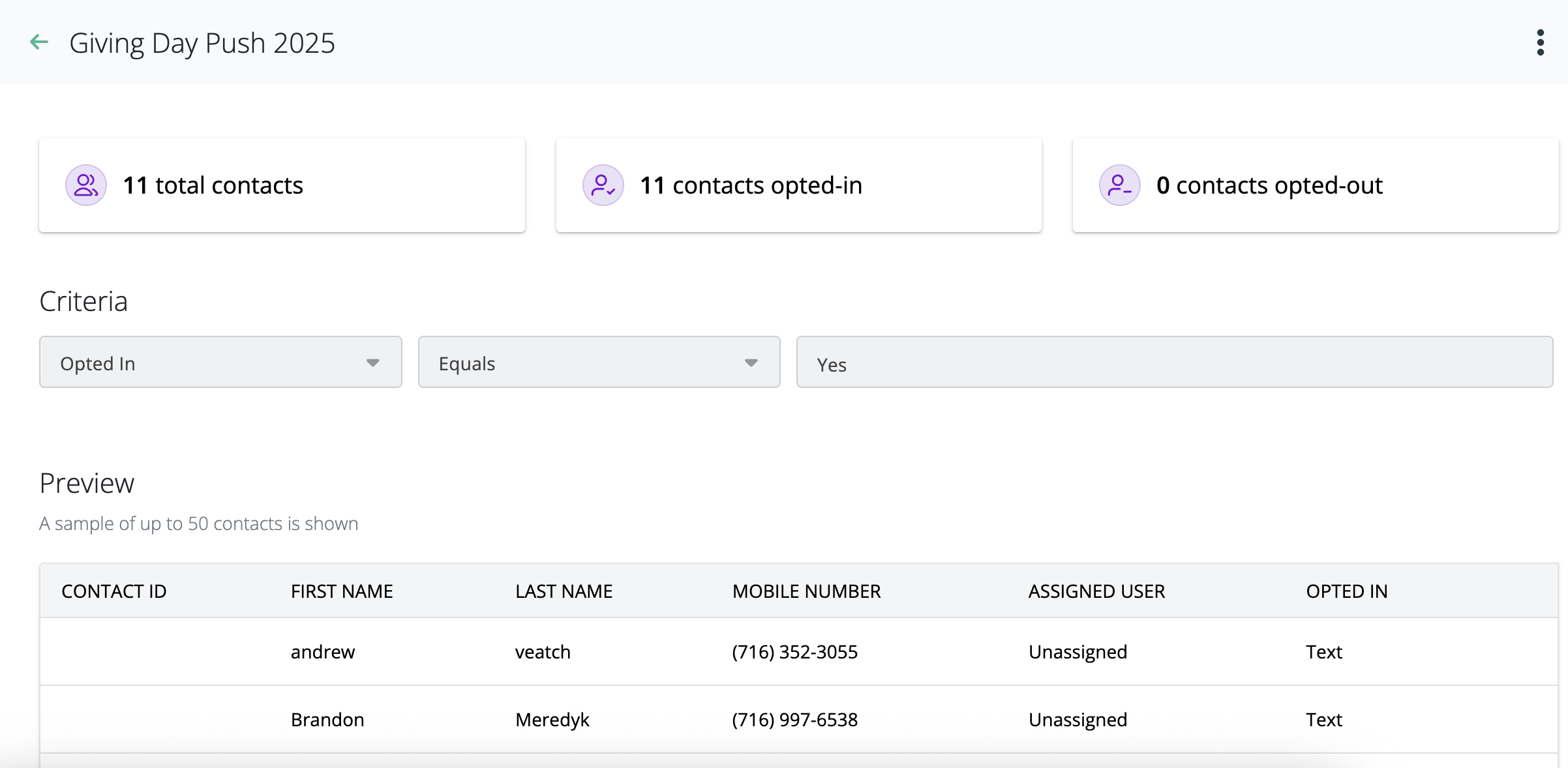 View will allow you to see which contacts were included in the Segment, how many are opted-in to receive text messages, and add or remove contacts.