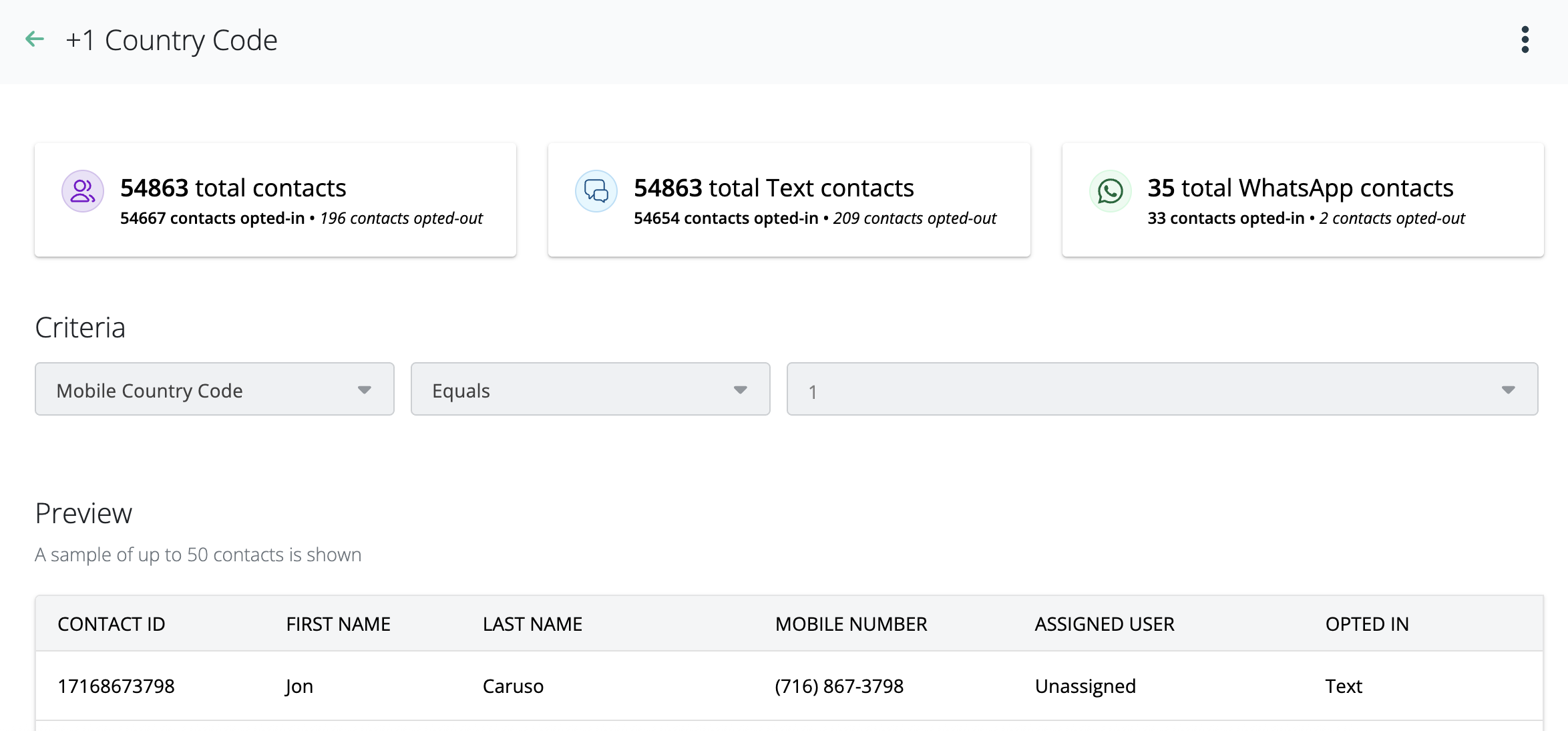 Total contacts: Total number of contacts that meet the criteria regardless of communication channel. Text + WhatsApp contacts