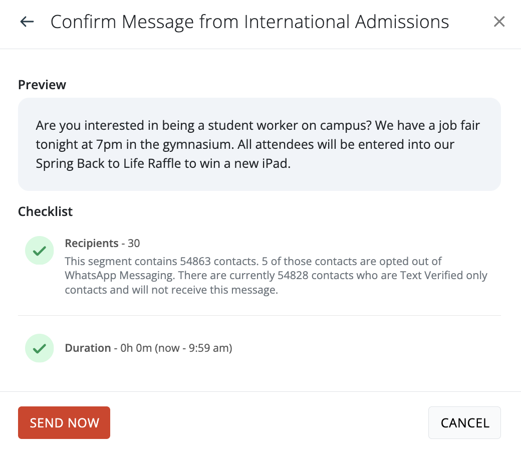 4. After reviewing your message, click [ Send Now] to send to the segment immediately, or [Schedule] to have the message sent at a future date and time.