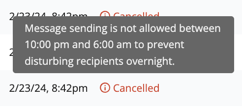 To be respectful of your recipients, Mongoose features a built-in protection to prevent the sending of text messages at inappropriate times. Messages cannot be sent or scheduled between the hours of 10pm - 6am. If you are attempting to send to a large group of recipients and the delivery duration falls between 10pm - 6am, Mongoose will display a warning message and prevent you from sending the message.