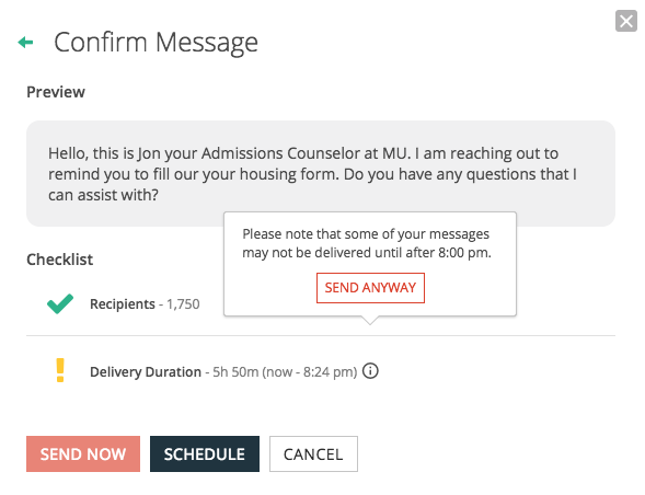 If the message delivery duration will cause some messages to be sent after 8pm, a warning will be displayed to notify you. If you are not concerned with messages being delivered that late, you can choose to click [ Send Anyway] and then send out the message. If you would rather wait, you can either cancel the message entirely or schedule it for a future date/time.