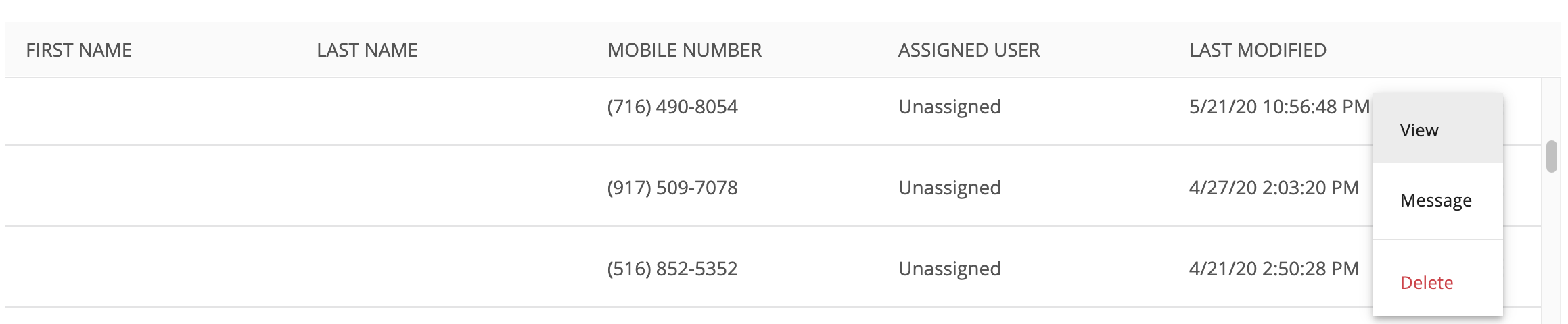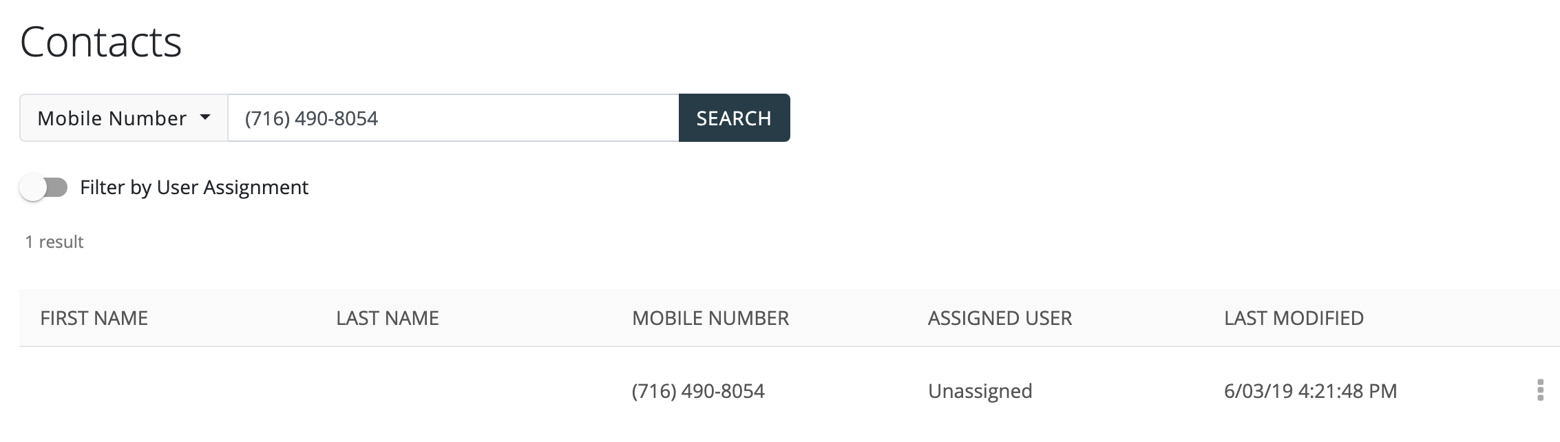 1. In order to edit an existing record, navigate to Contacts and search based on the Mobile Number (include all 10 digits; do not include spaces or other formatting).