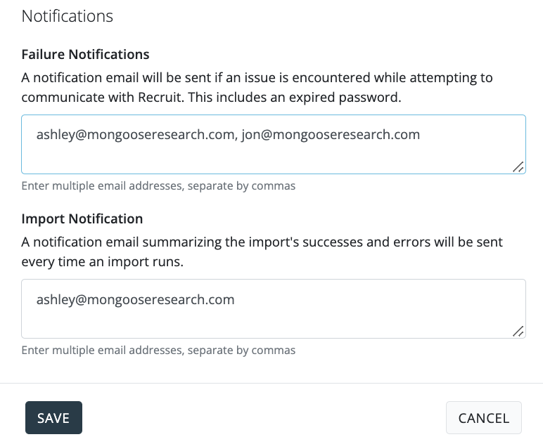 To receive email notifications around integration failures (connection to Recruit, password expiration etc..) or daily import notifications, please enter an email address (or multiple) for those who should receive those notifications.
