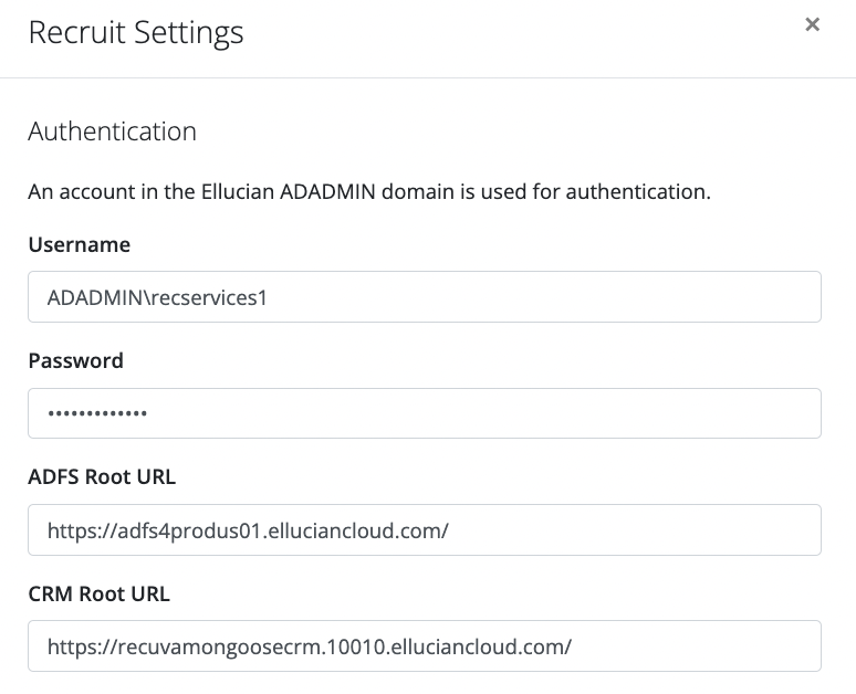 Fill in your Username, Password, ADFS Root URL will be prefilled, and your CRM Root URL from Recruit.