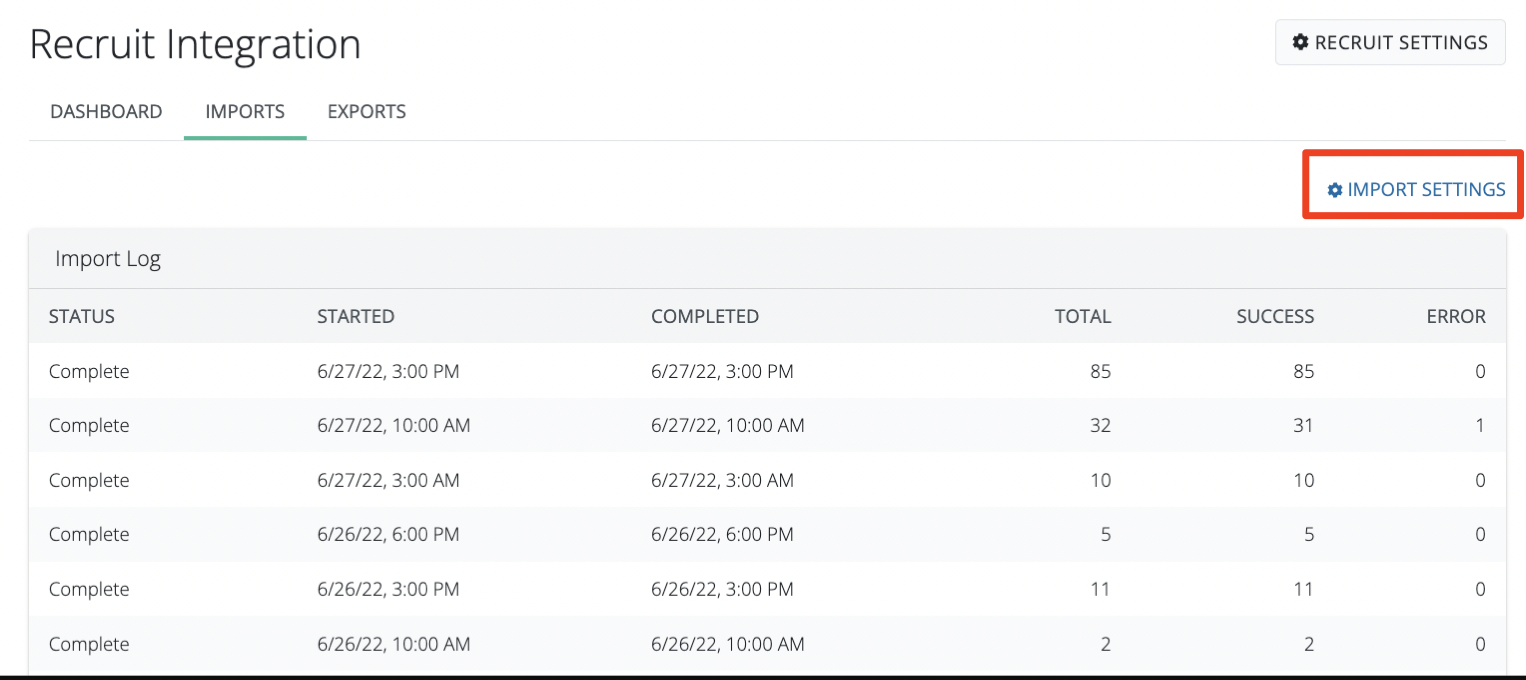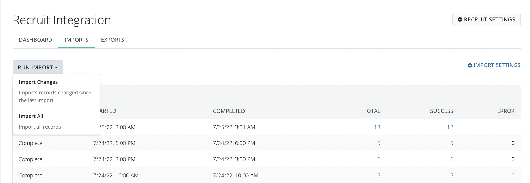 This page displays information for the most recent 50 imports. The total number of records in the import, number of successfully imported records, and number of errors are all displayed. Clicking on the download icon in the Total, Success or Error columns will generate a .CSV file showing specific records. The error file will provide specific import errors so they can be resolved.