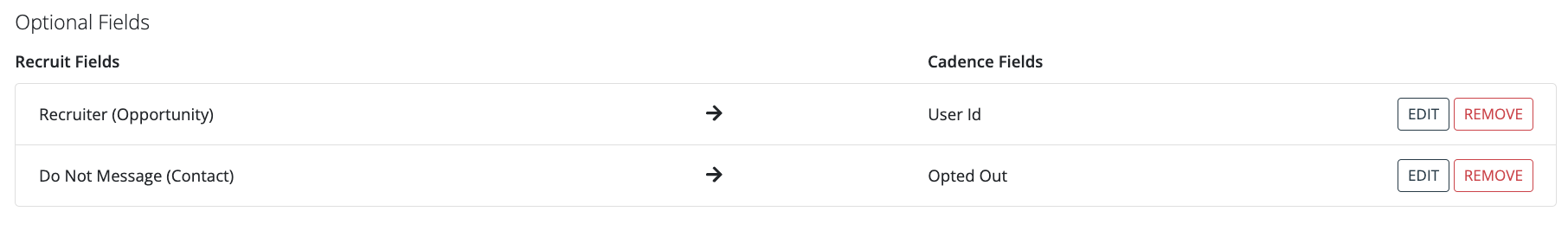 Opted Out - While this field is optional, it is required to be mapped if you'd like opt out changes to be sent back to Recruit. The opt out field can be mapped to where you store communication preferences in Recruit. Typically, we see mappings to the Do Not Message field in Recruit. While this field is optional, as a best practice, we highly recommend that you map this field so you know what the texting preference is for a contact and Mongoose can send any update/opt out changes back to Recruit.