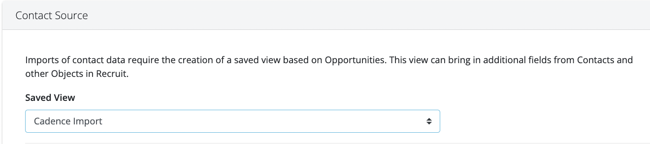 Contact Source is where you'll select the saved view for import and map all standard and custom fields.