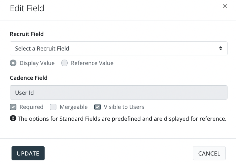 Select a Recruit field from the drop down. You can view the Recruit fields by Display Name or Reference Value depending on how they are named in your instance of Recruit.