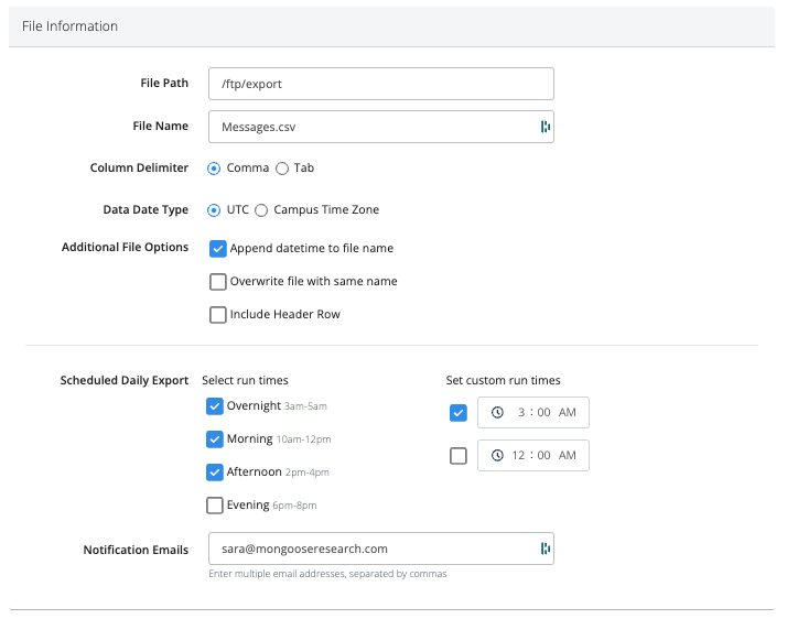 - Notification Emails (optional): Enter in an email address (or multiple email addresses, separated by a comma) to generate a notification email every time an export file has been transferred via FTP.
