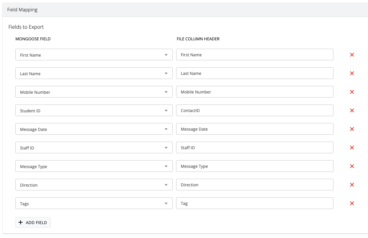 Choose the Mongoose Field from the dropdown on the left hand side, then type in what that field should be named in the export file. The name you type in will become the name of the column header (if you have chosen to include a column header in your export file).