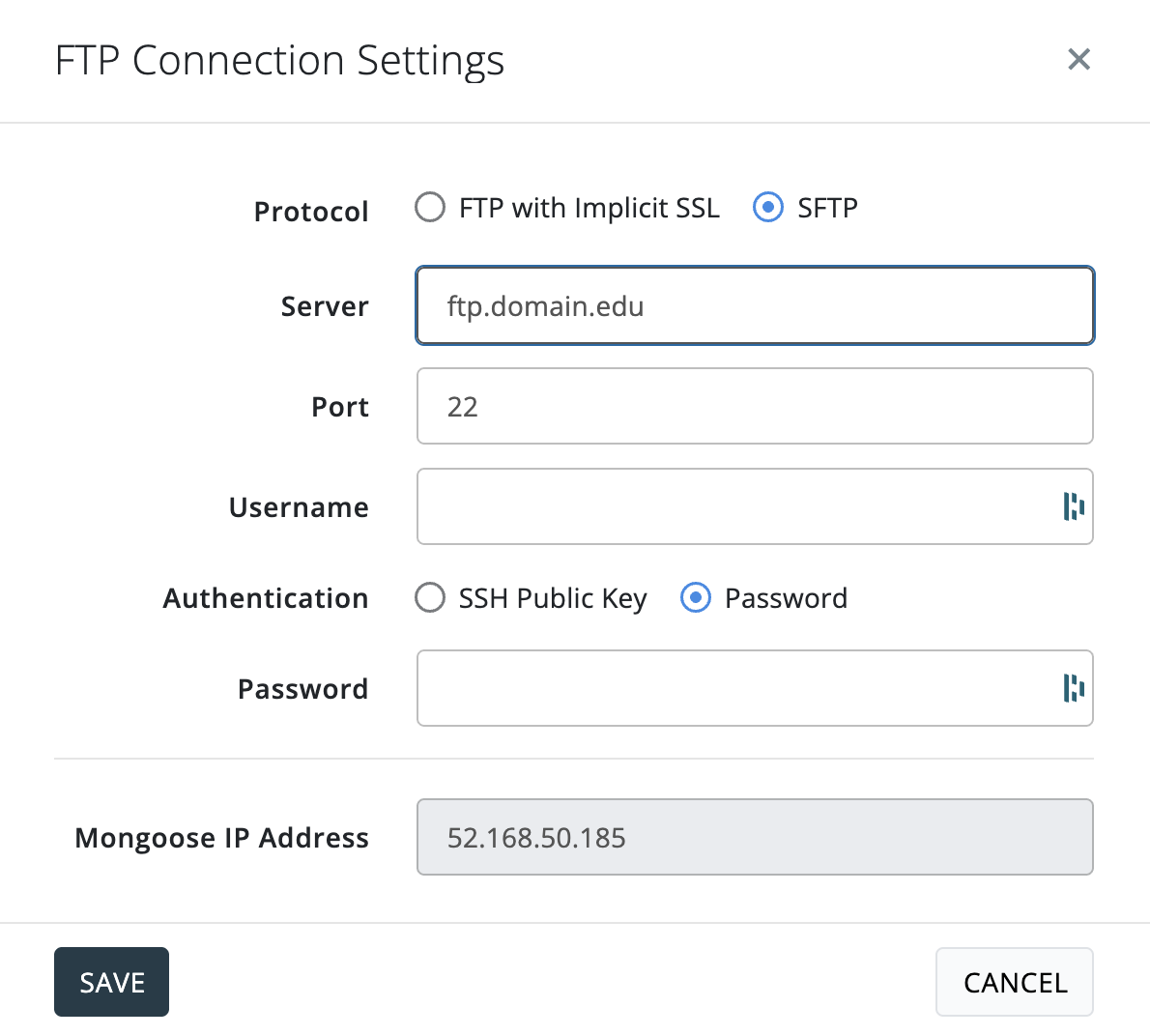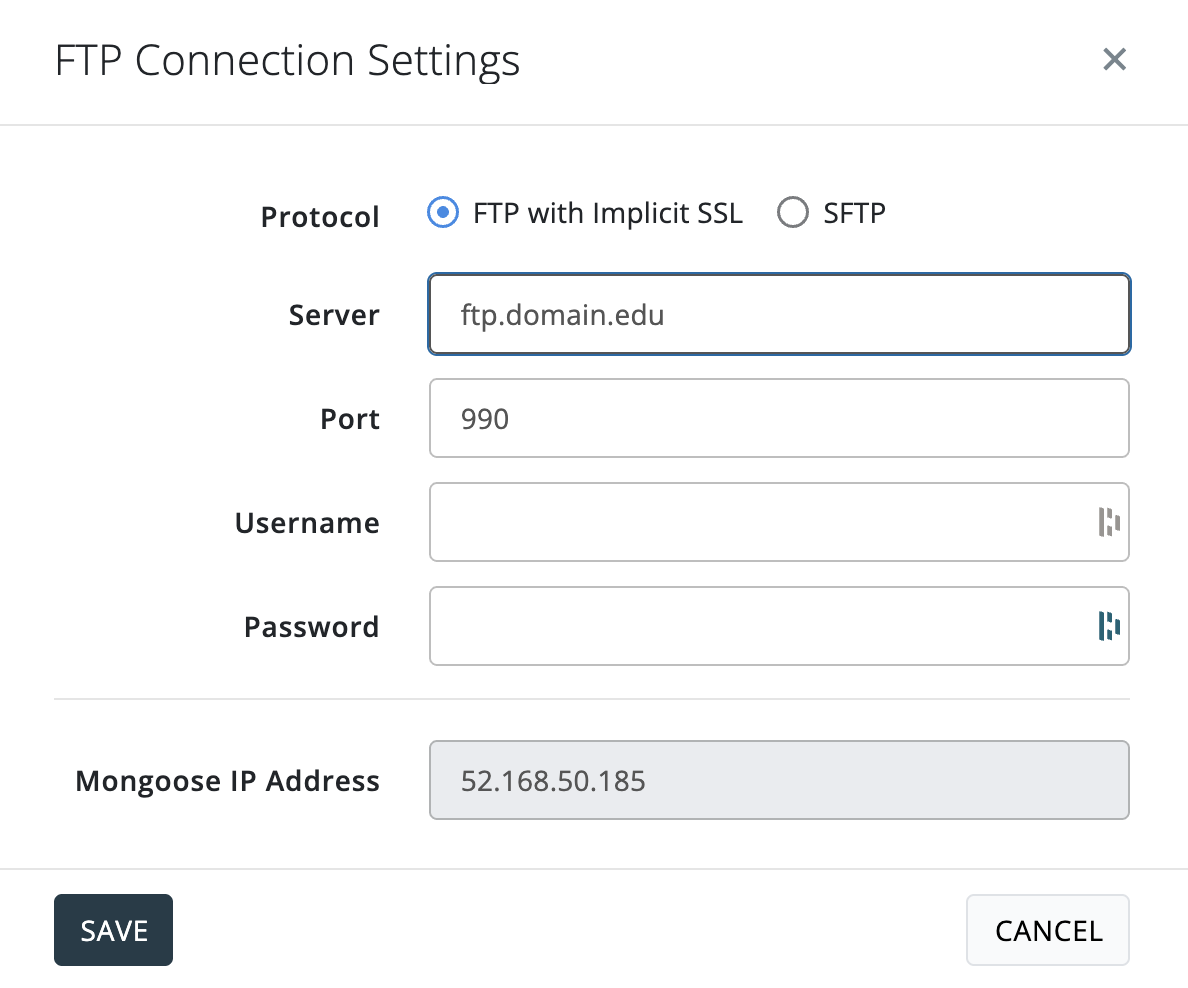 - Enter a Username and Password and note the Mongoose IP Address, as it may be needed for white-listing for firewall access to your FTP server.