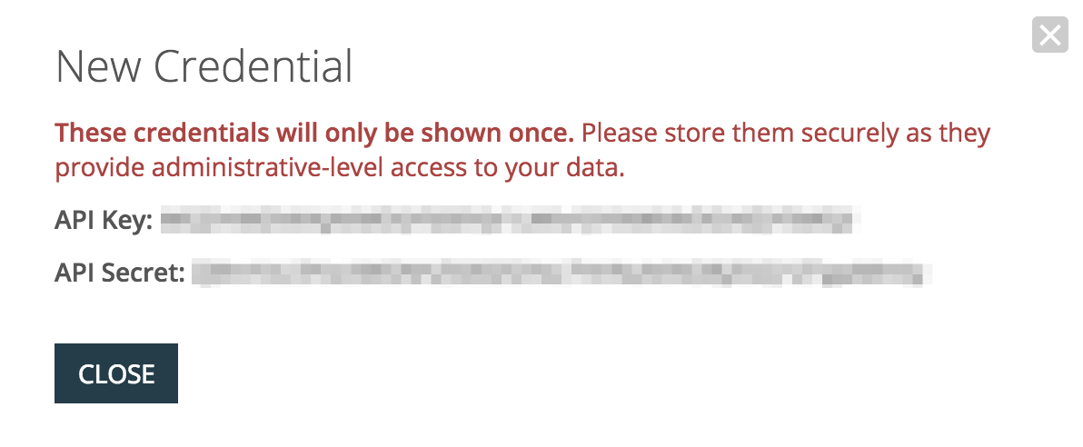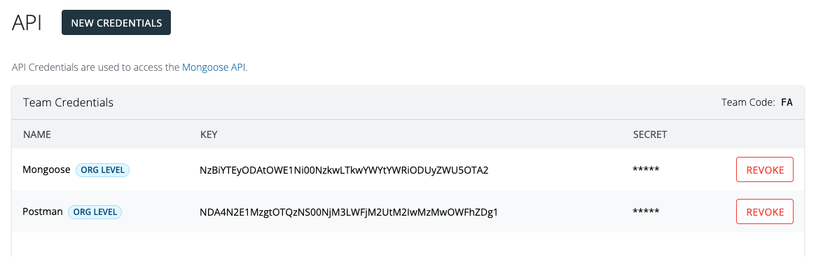 Mongoose API credentials can be generated in the platform under API > [New Credential]. These credentials must be provided in the request header when making requests using the API.