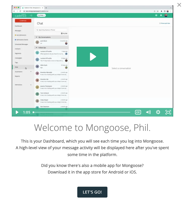 Mongoose provides self guided and hands-on in-product training to help you get started with our most important features so that you can get started texting right away.