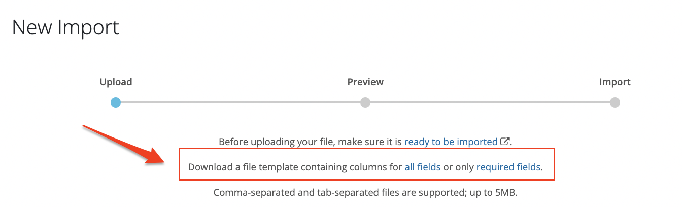 2. Required fields: This sample file will include all fields that are selected to be "Required" for import.