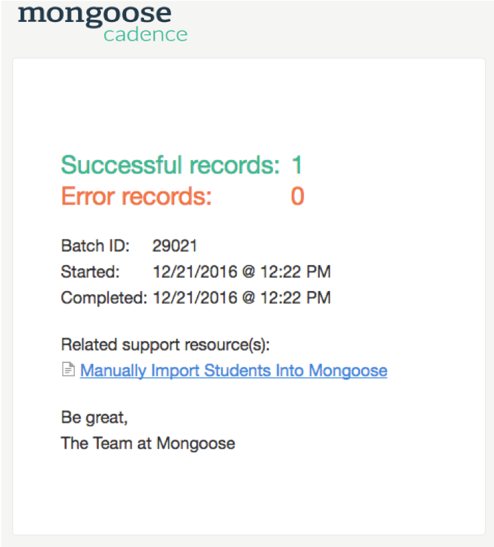 Each time you import contact data into Mongoose, you will receive a notification email detailing the batch ID #, date and time started, date and time completed, successful records, and error records.