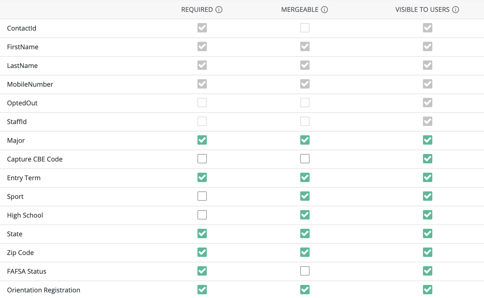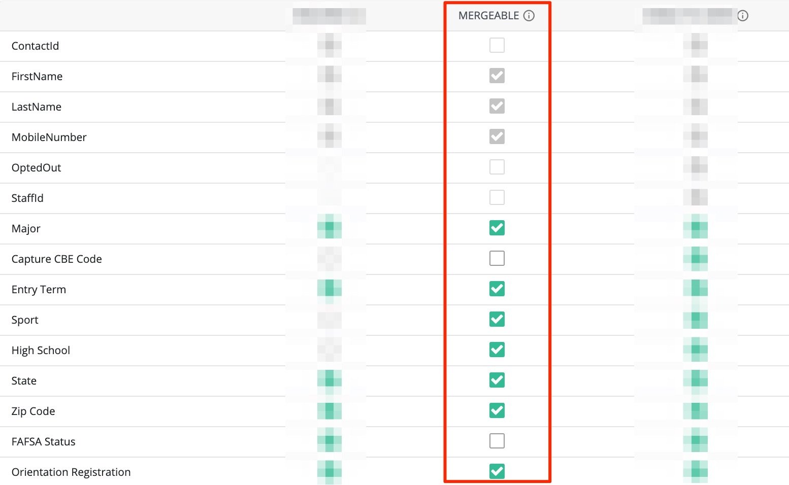 The check box in the Mergeable column controls whether or not the data is able to be merged into a text message by users in the team.