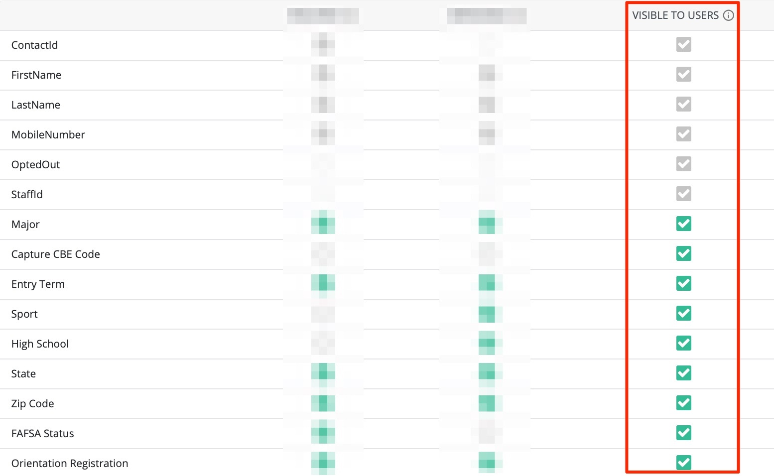 The check box in the Visible to Users column determines whether or not the field is visible to non-Admin users when viewing the contact record. If this box is unchecked, the data will only be visible to Admin users.